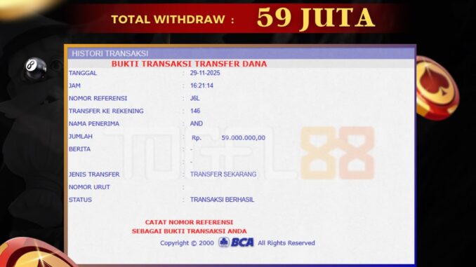 TOGEL88 mengucapkan selamat kepada user id : AND*** yang telah berhasil mendapatkan jackpot pada permainan LIVE CASINO DI 24D SPIN . Kemenangan sebesar Rp 59.00.000,-. telah dibayarkan LUNAS oleh pihak TOGEL88 kepada pemilik user id setelah yang bersangkutan mengisi formulir withdraw. Proses pencairan dana berlangsung sangat cepat hanya dalam waktu 5-10 menit sudah berada dalam rekening pemilik user id. Bukti transfer yang dapat anda lihat adalah bukti SAH / VALID yang langsung di dapatkan melalui bukti transaksi dari Bank yang digunakan untuk pengiriman dana pada rekening pemilik user id. Terima kasih kami sampaikan kepada para pengguna setia TOGEL88 yang telah menggunakan situs kami, sebagai Bandar Terpercaya yang pastinya membayar semua kemenangan member hingga lunas. Apakah TOGEL88 PENIPU ? Reputasi “TOGEL88 TERPERCAYA” sudah sangat melekat. puluhan hingga ratusan ribu pengguna setia TOGEL88 tetap menggunakan situs terbesar dan terbaik di Indonesia ini. Hapus rasa was-was dan khawatir anda, kemenangan anda berapapun PASTI dibayarkan hingga lunas.