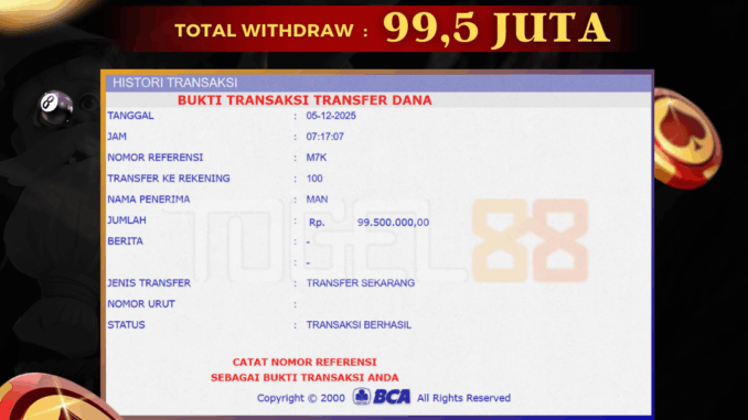 TOGEL88 mengucapkan selamat kepada user id : MAN*** yang telah berhasil mendapatkan jackpot pada permainan LIVE CASINO DI POKER DICE . Kemenangan sebesar Rp 99.500.000,-. telah dibayarkan LUNAS oleh pihak TOGEL88 kepada pemilik user id setelah yang bersangkutan mengisi formulir withdraw. Proses pencairan dana berlangsung sangat cepat hanya dalam waktu 5-10 menit sudah berada dalam rekening pemilik user id. Bukti transfer yang dapat anda lihat adalah bukti SAH / VALID yang langsung di dapatkan melalui bukti transaksi dari Bank yang digunakan untuk pengiriman dana pada rekening pemilik user id. Terima kasih kami sampaikan kepada para pengguna setia TOGEL88 yang telah menggunakan situs kami, sebagai Bandar Terpercaya yang pastinya membayar semua kemenangan member hingga lunas. Apakah TOGEL88 PENIPU ? Reputasi “TOGEL88 TERPERCAYA” sudah sangat melekat. puluhan hingga ratusan ribu pengguna setia TOGEL88 tetap menggunakan situs terbesar dan terbaik di Indonesia ini. Hapus rasa was-was dan khawatir anda, kemenangan anda berapapun PASTI dibayarkan hingga lunas.