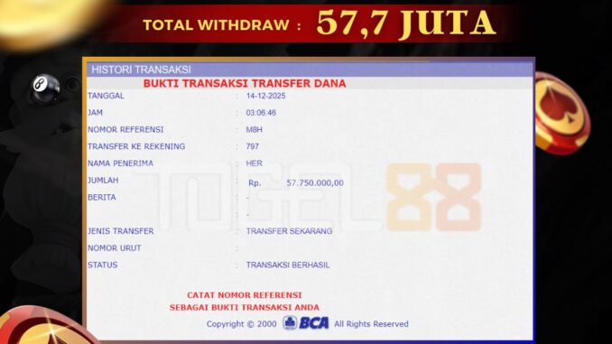 TOGEL88 mengucapkan selamat kepada user id : KIM*** yang telah berhasil mendapatkan jackpot pada permainan LIVE CASINO DI SHIO FIGHTS. Kemenangan sebesar Rp 57.750.000,-. telah dibayarkan LUNAS oleh pihak TOGEL88 kepada pemilik user id setelah yang bersangkutan mengisi formulir withdraw. Proses pencairan dana berlangsung sangat cepat hanya dalam waktu 5-10 menit sudah berada dalam rekening pemilik user id. Bukti transfer yang dapat anda lihat adalah bukti SAH / VALID yang langsung di dapatkan melalui bukti transaksi dari Bank yang digunakan untuk pengiriman dana pada rekening pemilik user id. Terima kasih kami sampaikan kepada para pengguna setia TOGEL88 yang telah menggunakan situs kami, sebagai Bandar Terpercaya yang pastinya membayar semua kemenangan member hingga lunas. Apakah TOGEL88 PENIPU ? Reputasi “TOGEL88 TERPERCAYA” sudah sangat melekat. puluhan hingga ratusan ribu pengguna setia TOGEL88 tetap menggunakan situs terbesar dan terbaik di Indonesia ini. Hapus rasa was-was dan khawatir anda, kemenangan anda berapapun PASTI dibayarkan hingga lunas.