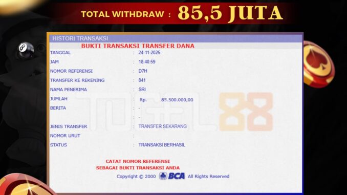 TOGEL88 mengucapkan selamat kepada user id : SRI*** yang telah berhasil mendapatkan jackpot pada permainan LIVE CASINO DI BACCARAT. Kemenangan sebesar Rp 85.500.000,-. telah dibayarkan LUNAS oleh pihak TOGEL88 kepada pemilik user id setelah yang bersangkutan mengisi formulir withdraw. Proses pencairan dana berlangsung sangat cepat hanya dalam waktu 5-10 menit sudah berada dalam rekening pemilik user id. Bukti transfer yang dapat anda lihat adalah bukti SAH / VALID yang langsung di dapatkan melalui bukti transaksi dari Bank yang digunakan untuk pengiriman dana pada rekening pemilik user id. Terima kasih kami sampaikan kepada para pengguna setia TOGEL88 yang telah menggunakan situs kami, sebagai Bandar Terpercaya yang pastinya membayar semua kemenangan member hingga lunas. Apakah TOGEL88 PENIPU ? Reputasi “TOGEL88 TERPERCAYA” sudah sangat melekat. puluhan hingga ratusan ribu pengguna setia TOGEL88 tetap menggunakan situs terbesar dan terbaik di Indonesia ini. Hapus rasa was-was dan khawatir anda, kemenangan anda berapapun PASTI dibayarkan hingga lunas.