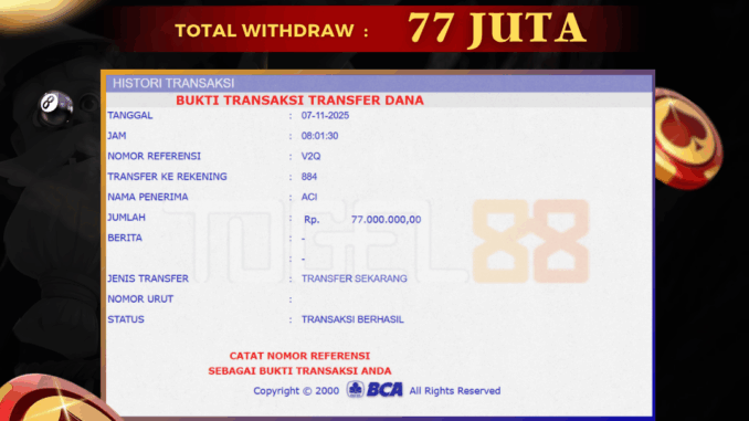 TOGEL88 mengucapkan selamat kepada user id : JON*** yang telah berhasil mendapatkan jackpot pada permainan LIVE CASINO DI ROULETTE. Kemenangan sebesar Rp 77.000.000,-. telah dibayarkan LUNAS oleh pihak TOGEL88 kepada pemilik user id setelah yang bersangkutan mengisi formulir withdraw. Proses pencairan dana berlangsung sangat cepat hanya dalam waktu 5-10 menit sudah berada dalam rekening pemilik user id. Bukti transfer yang dapat anda lihat adalah bukti SAH / VALID yang langsung di dapatkan melalui bukti transaksi dari Bank yang digunakan untuk pengiriman dana pada rekening pemilik user id. Terima kasih kami sampaikan kepada para pengguna setia TOGEL88 yang telah menggunakan situs kami, sebagai Bandar Terpercaya yang pastinya membayar semua kemenangan member hingga lunas. Apakah TOGEL88 PENIPU ? Reputasi “TOGEL88 TERPERCAYA” sudah sangat melekat. puluhan hingga ratusan ribu pengguna setia TOGEL88 tetap menggunakan situs terbesar dan terbaik di Indonesia ini. Hapus rasa was-was dan khawatir anda, kemenangan anda berapapun PASTI dibayarkan hingga lunas.